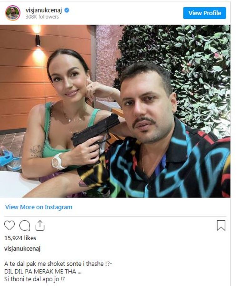 Aktori i humorit, Visjan Ukcenajka ndarë me ndjekësit e tij një foto me bashkëshorten, e cila i ka vendosur në kokë një pistoletë lodër.
