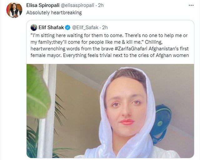 Novelistja dhe publicistja turko-britanike, Elif Shafak ka publikuar në rrjete sociale, fjalët rrëqethëse të zonjës Zarifa Ghafari, kryebashkiakes së parë femër në Afganistan, tanimë që i gjithë shteti është në duar të talebanëve.