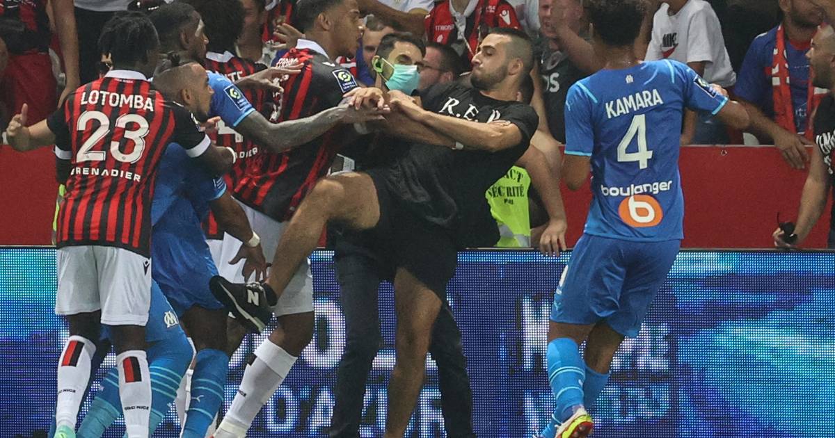 Loja filloi të nxehet dhe ndeshja u ndërpre për shkak të ultrasve të Nice, të cilët kërcyen pengesat për të goditur disa lojtarë të Marsejës dhe krijuan pamje të turpshme për një fushë futbolli.