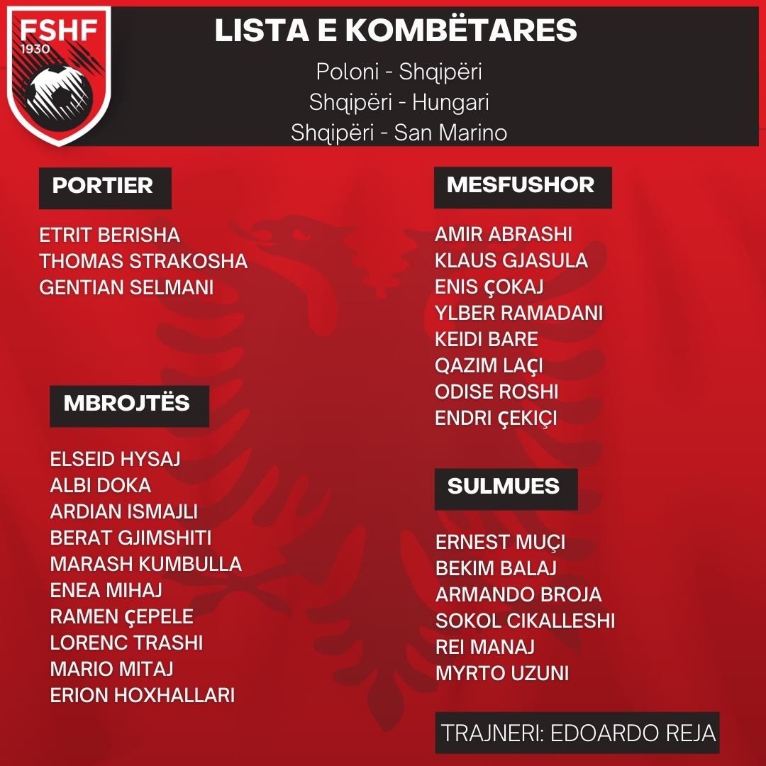 Lista është e përbërë nga 27 lojtarë, ndërkohë që mes risive janë debutuesi Ernest Muçi, i cili vjen nga Kombëtarja U-21, teksa ndryshe nga miqësoret e qershorit rikthehen në listë të rinjtë Ramen Çepele, Mario Mitaj, Enis Çokaj dhe Armando Broja.