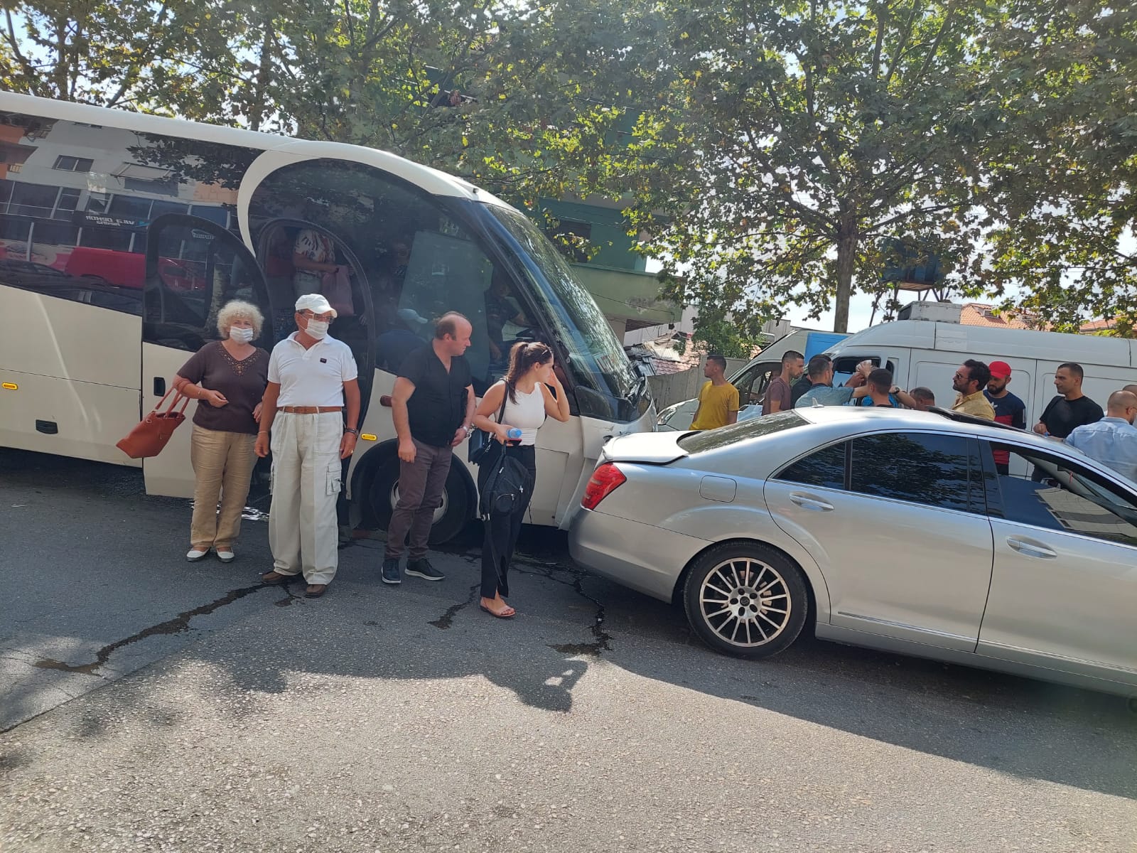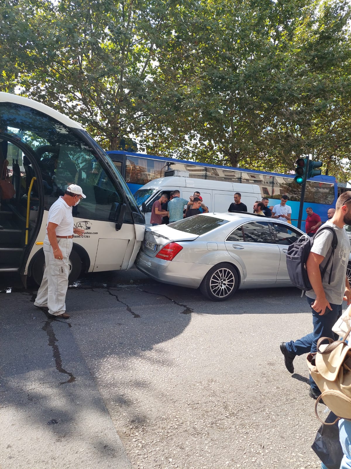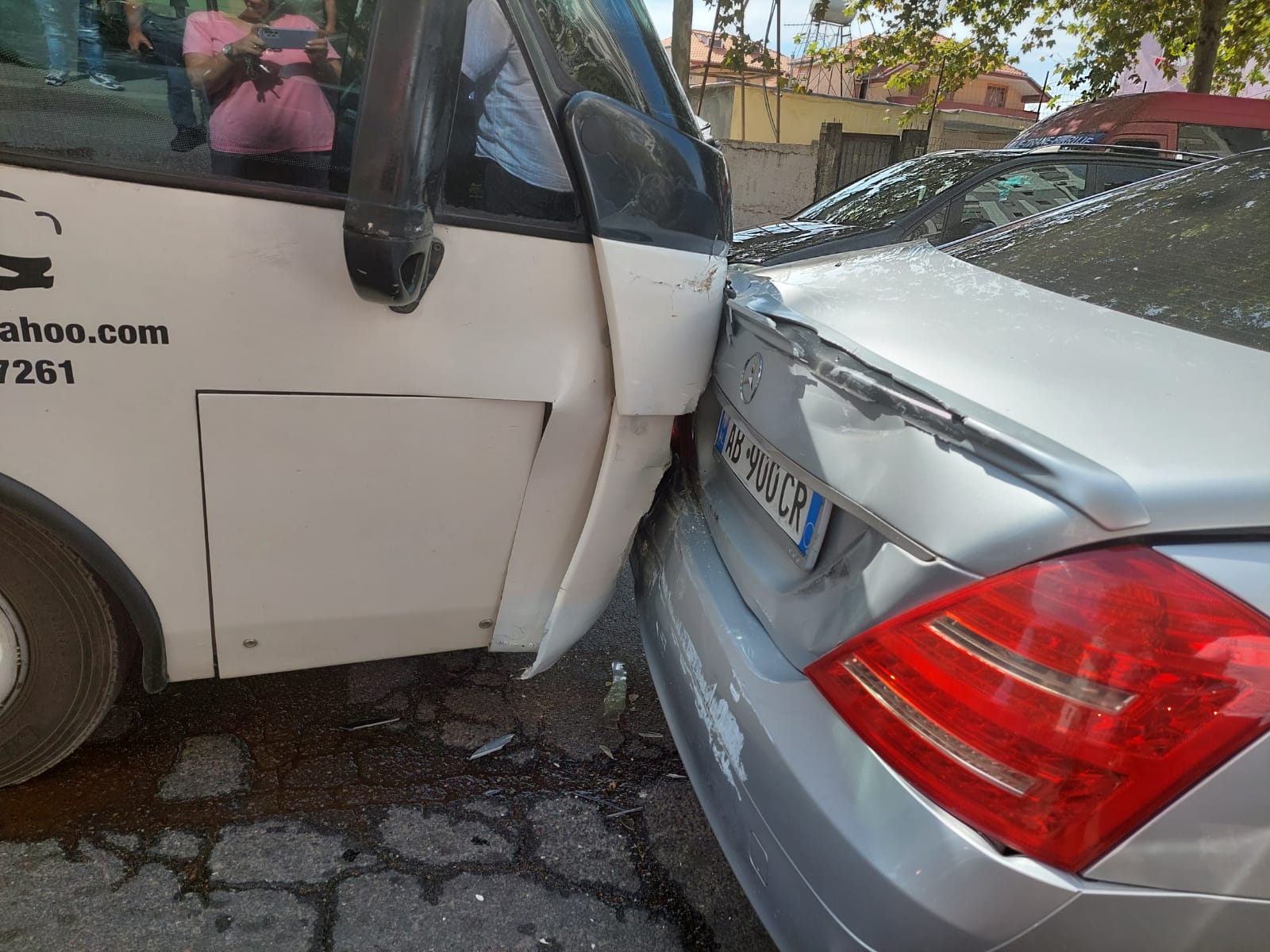 Bashkëpunëtori i noa.al në vendngjarje, raporton se para pak minutash, 14.15, autobusi që shikoni në fotot e galerisë, humbi kontrollin, mesa duket nga mosfunksionimi i frenave dhe u përplas me këtë makinë tip Benz e cila ndodhej e ndaluar pranë terminalit të autobusëve në dalje të Tiranës.