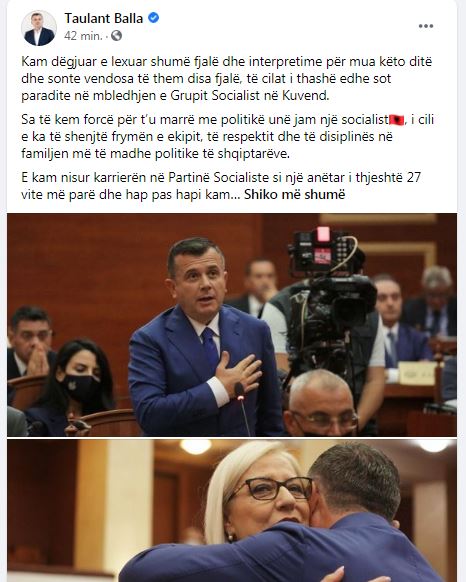 Përmes një postimi në rrjetin social facebook Balla deklaron se sa të ketë forcë për tu marrë me politikë do të jetë një socialist, i cili e ka të shenjtë frymën e ekipit, të respektit dhe të disiplinës në familjen e tij politike.