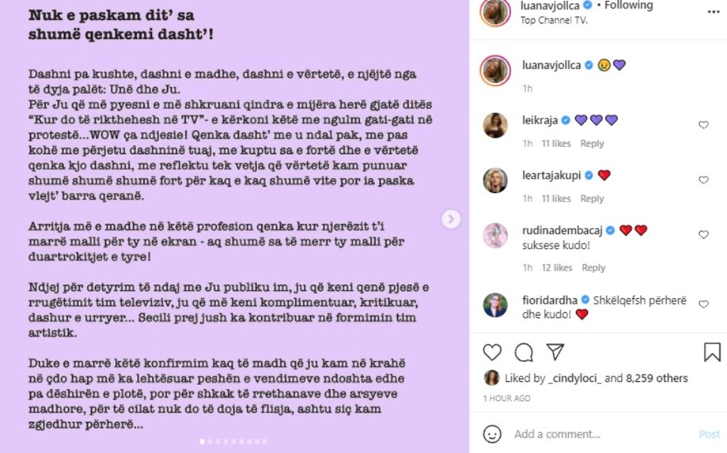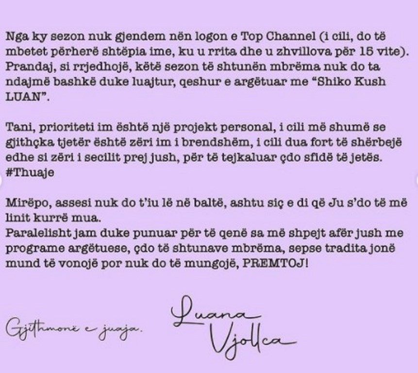 “Nuk e paskam ditur sa shume jemi dashur. Dashuri pa kushte, dashuri e madhe, dashuri e vërtetë. Unë dhe ju. Për ju që pyesni kur do kthehem në ekran dhe e kërkoni me ngulm, çfarë ndjesie. Duhet të ndalesha pak për të përjetuar dashurinë tuaj. Arritja më e madhe në këtë është kur shëh që njërzit i merr malli për ty në ekran. Prandaj ndjej që për ju publikun tim, ata që me kanë dashur, urryer, komentuar, kritikuar…secili prej jush ka kontribuar në formimin tim. Nga ky sezon nuk do të jem më pjesë e logos se Top Channel. Tani prioritet për mua është nje projekt personal i cili do të jetë edhe zëri im i brëndshëm. Por asnjëherë nuk do ju lë në baltë ashtu si ju nuk më keni lënë mua”, është shprehur Luana.