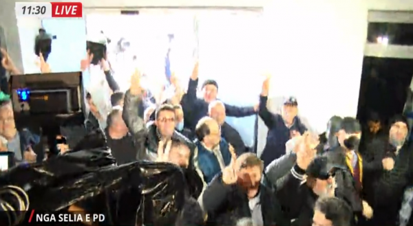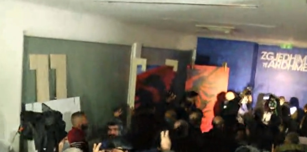 Protestuesit kanë shqyer derën kryesore të selisë së PD-së. Me gishta lart, disa prej tyre kanë hyrë brenda duke bërtitur ‘Sali Berisha, Sali Berisha’. Përveç kësaj kanë thyer edhe xhamat e dyerve të selisë blu duke hyrë në pjesën e hollit.