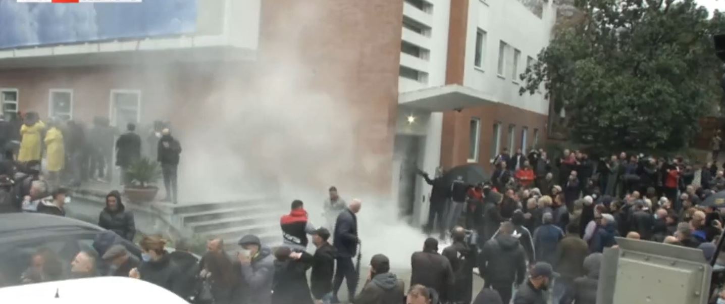 Teksa po përpiqen të hyjnë në selinë blu, protestuesit sulmohen nga persona brenda zyrës së Lulzim Bashës. Protestuesit kanë goditur me gurë ndërsa kundërpërgjigja ka ardhur me gaz lotsjellës.