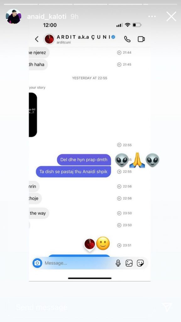 Më pas, ai publikon sërish një bisedë me ish-konkurrentin Ardit Çuni, ku i thotë atij se Einxhel “del dhe hyn prapë”.