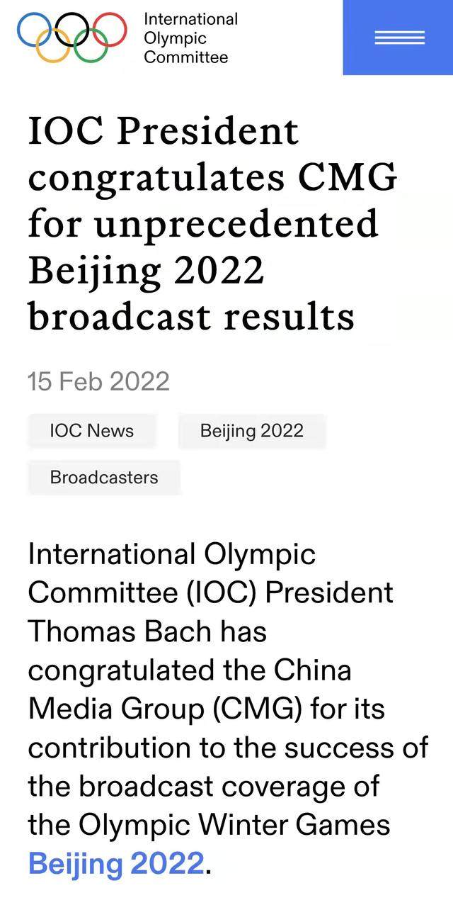 Bach vlerësoi lart ndjenjën e përgjegjësisë, inovacionin dhe kontributin e jashtëzakonshëm të CMG-së dhe presidentit të saj Shen Haixiong në promovimin e kauzës ndërkombëtare të Lojërave Olimpike dhe shprehu vlerësimin për performancën e shkëlqyer të CMG-së në transmetimin e Lojërave Olimpike Dimërore të Pekinit.