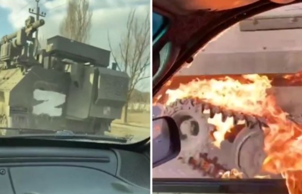 Në një video të publikuar në Twitter, shihet një që vajzë i hedh molotov një tanku rus të parkuar duke e shkrumbuar në flakë.