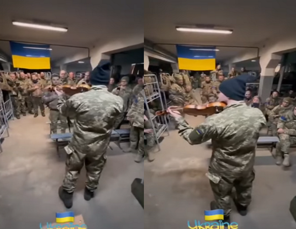 Ushtari në video, i cili në paqe luante në violinë për t’u relaksuar, sot la për një moment armën mënjanë dhe interpreton himnin kombëtar për shokët e tij ushtarë.
