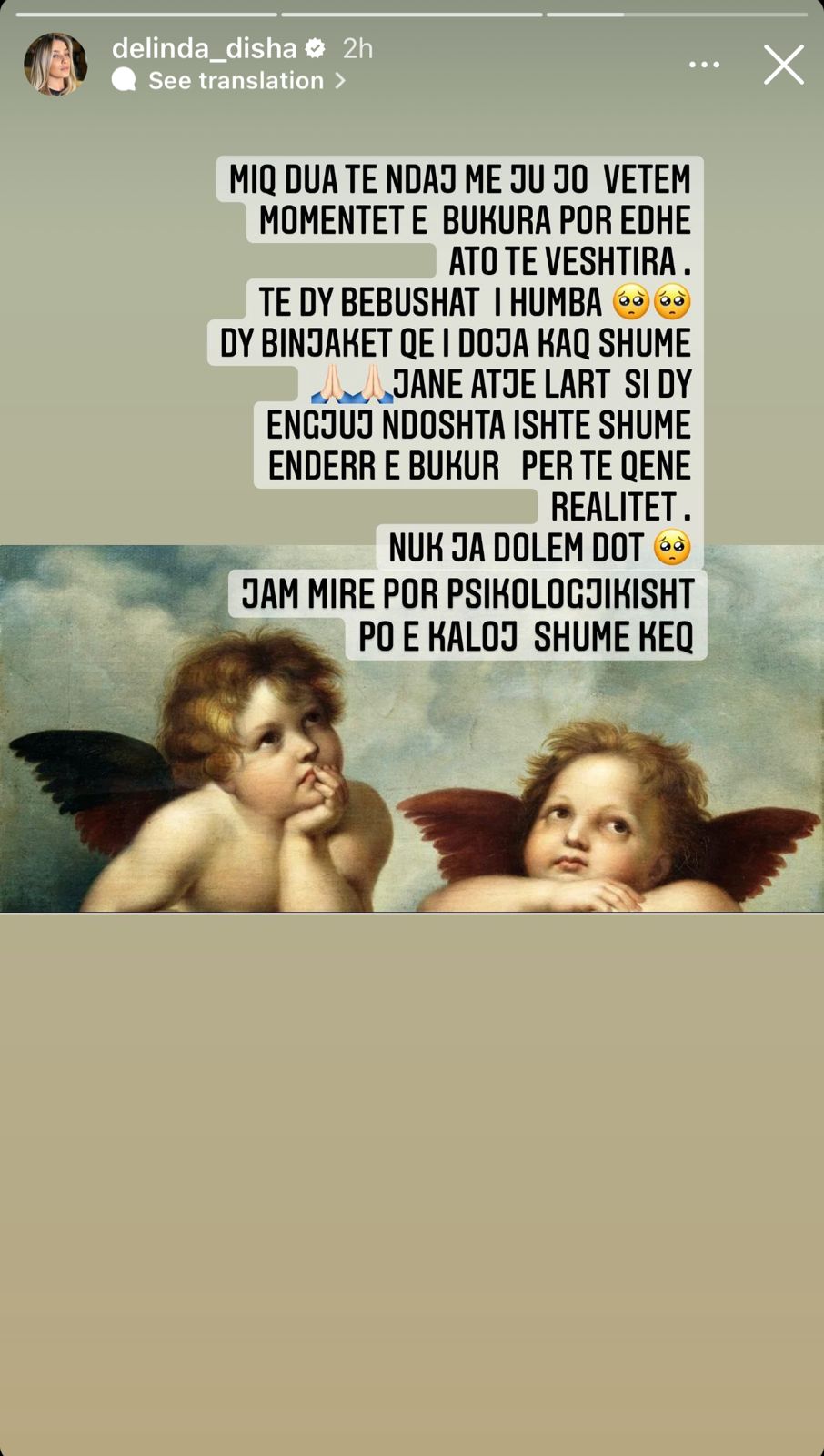 “Miq dua të ndaj me ju jo vetëm momentet e bukura, por edhe ato të vështira. Të dy bebushat humba, dy binjakët që i doja kaq shumë janë atje lart si dy engjëj, ndoshta ishte shumë ëndërr e bukur për të qenë realitet. Nuk ia dolëm dot. Jam mirë, por psikologjikisht po e kaloj shumë keq”, shkruan Delinda.