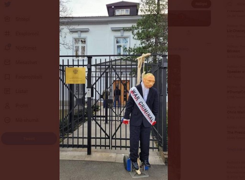 Së fundmi, në shenjë proteste kundër luftës në Ukrainë, një grup qytetarësh kanë vendosur një kukull “Putin” të varur përpara ambasadës rusë ne Oslo. Duart e kukullës Putin janë të lyera në gjak, ndërsa mbi trupin e tij kanë vendosur një shirit “kriminel lufte”.
