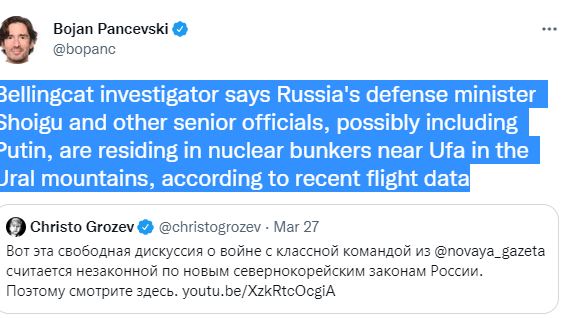 Përmes një postimi në twitter, hetuesi ka zbuluar se ministri rus i mbrojtjes, presidenti Putin dhe zyrtarë të tjerë, janë duke u strehuar në bunkierë bërthamorë.