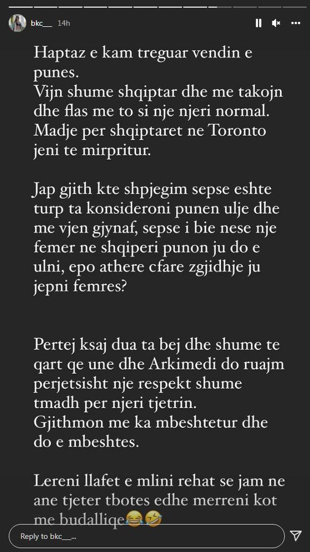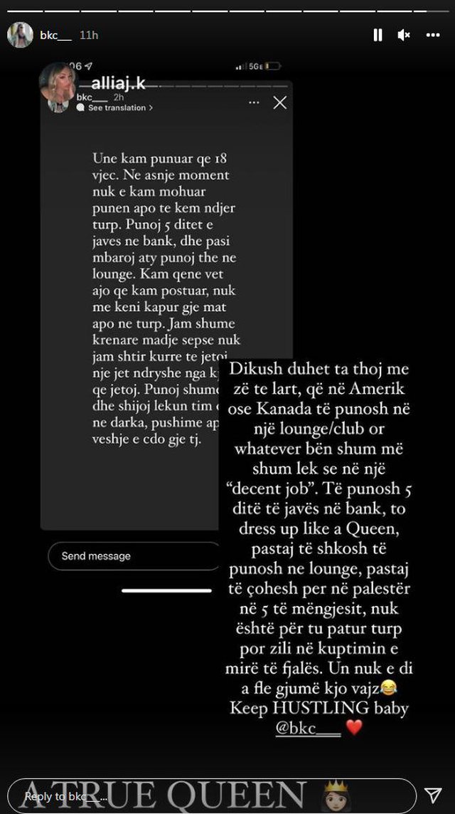 “Unë kam punuar që 18 vjeç. Në asnjë moment nuk e kam mohuar punën apo të kem ndjerë turp. Punoj pesë ditët e javës në bankë dhe pasi mbaroj aty, punoj në the lounge. Kam qenë vetë ajo që kam postuar, nuk më keni kapur gjë mat apo në turp. Jam shumë krenare madje, sepse nuk jam shtirur kurrë të jetoj një jetë ndryshe nga kjo që jetoj. Punoj shumë dhe shijoj lekun tim, qoftë në darka, pushime apo veshje e çdo gjë tjetër.”- shkruan Keisi.