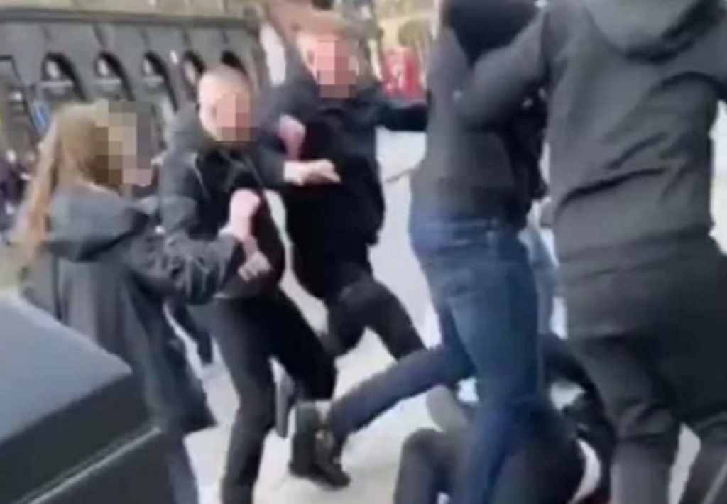 Angli- Një përleshje mes tifozëve rivalë pas një ndeshjeje futbolli në qendër të qytetit të Bolton, Manchester Great.