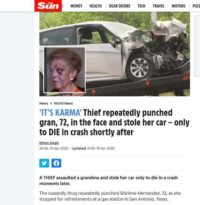 “The Sun” shkruan se ai goditi në mënyrë të përsëritur Shirlene Hernandez, 72 vjeç, ndërsa ajo ndaloi për pije freskuese në një pikë karburanti në San Antonio.