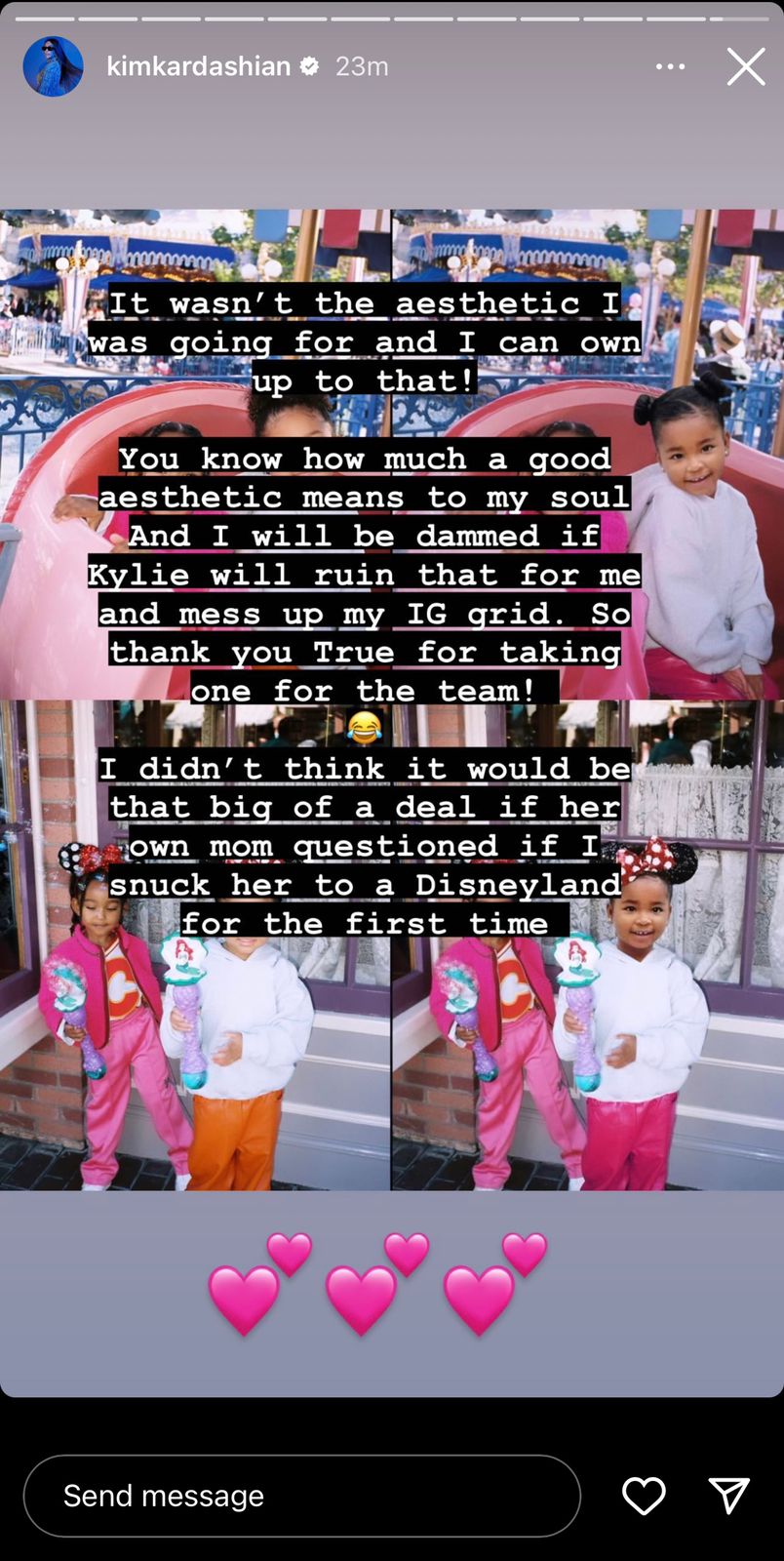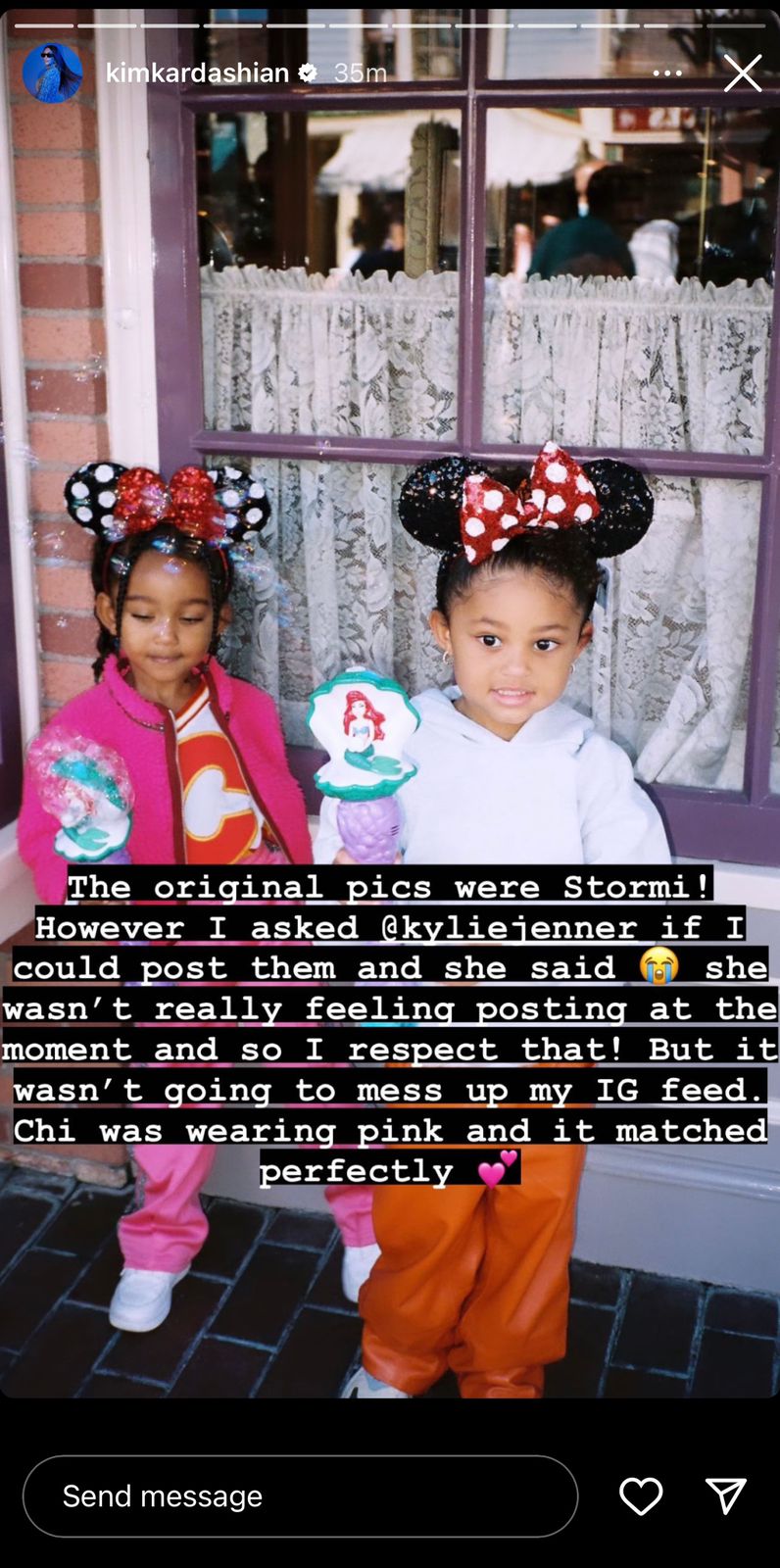 “Në foton origjinale është Stormi! Pyeta Kylie Jenner nëse mund ti postoja dhe ajo nuk kishte shumë dëshirë që ti postoja në atë moment dhe unë e respektova. Por nuk do të më prishte feed-in tim të ‘Instagram’-it. Chi kishte veshur ngjyrë rozë dhe kombinoi në mënyrë perfekte.”– shkruan Kim.