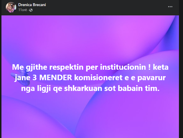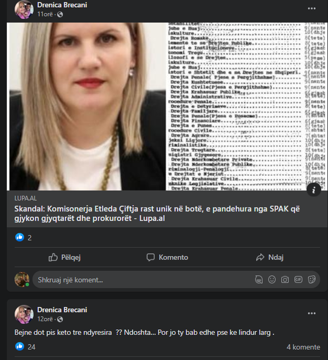 TIRANË- KPK ka shkarkuar dje nga detyra ish-Prokurorin e Tiranës, Bajram Breçanit. Vajza e tij, Drenica Breçani, ka reaguar ashpër pas vendimit të marrë një ditë më parë nga Komisioni i Pavarur i Kualifikimit. Përmes një postimi të bërë në rrjetet sociale, vajza e Breçanit ofendon trupën gjykuese të përbërë nga Etleda Çiftja, Pamela Qirko, Roland Ilia, të cilët morën vendimin e djeshëm. Më tej, ajo ka ndarë artikuj të ndryshëm që kanë të bëjnë me këto tre komisionerë që sipas saj nuk janë aspak të pavarur.