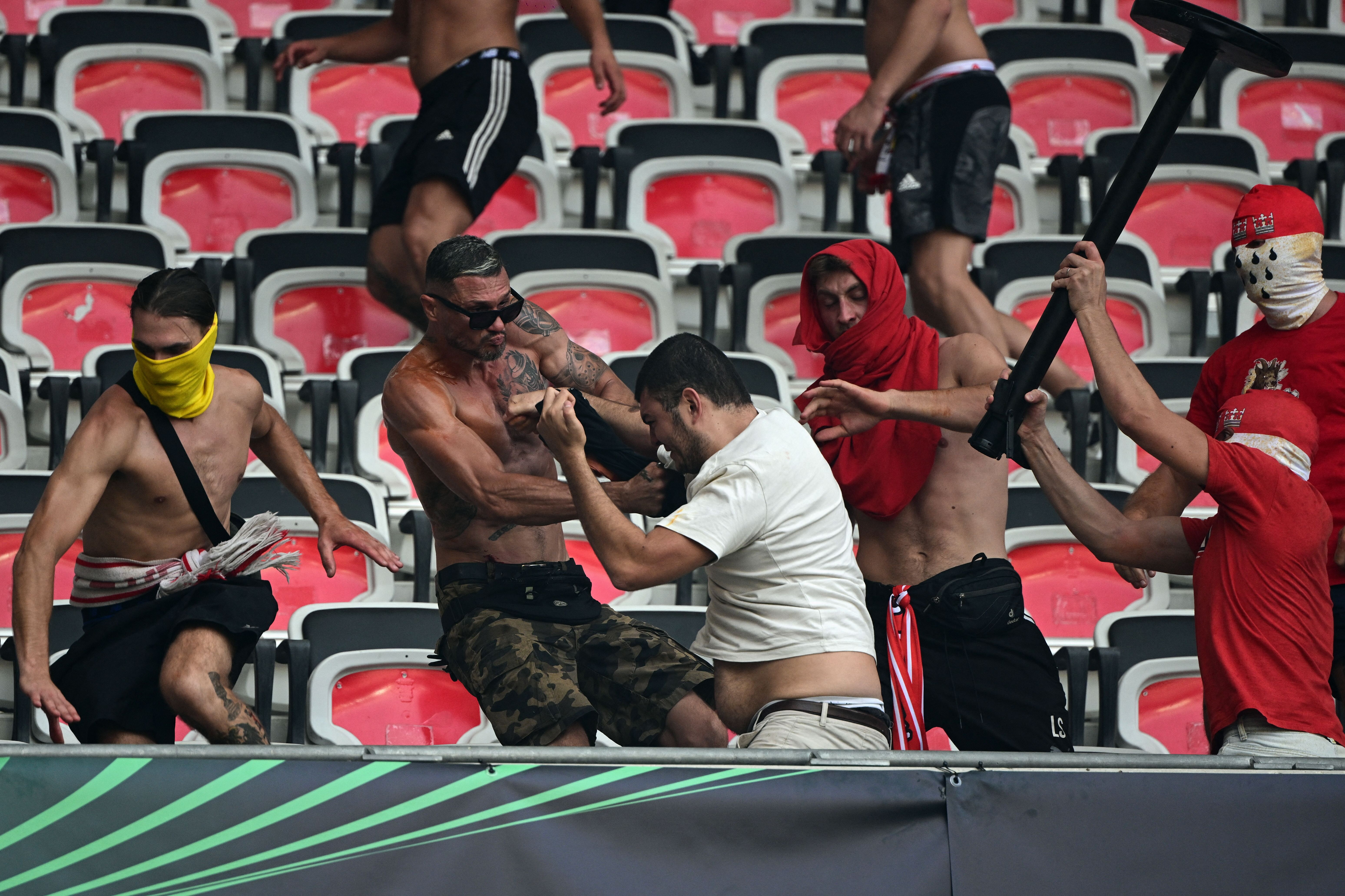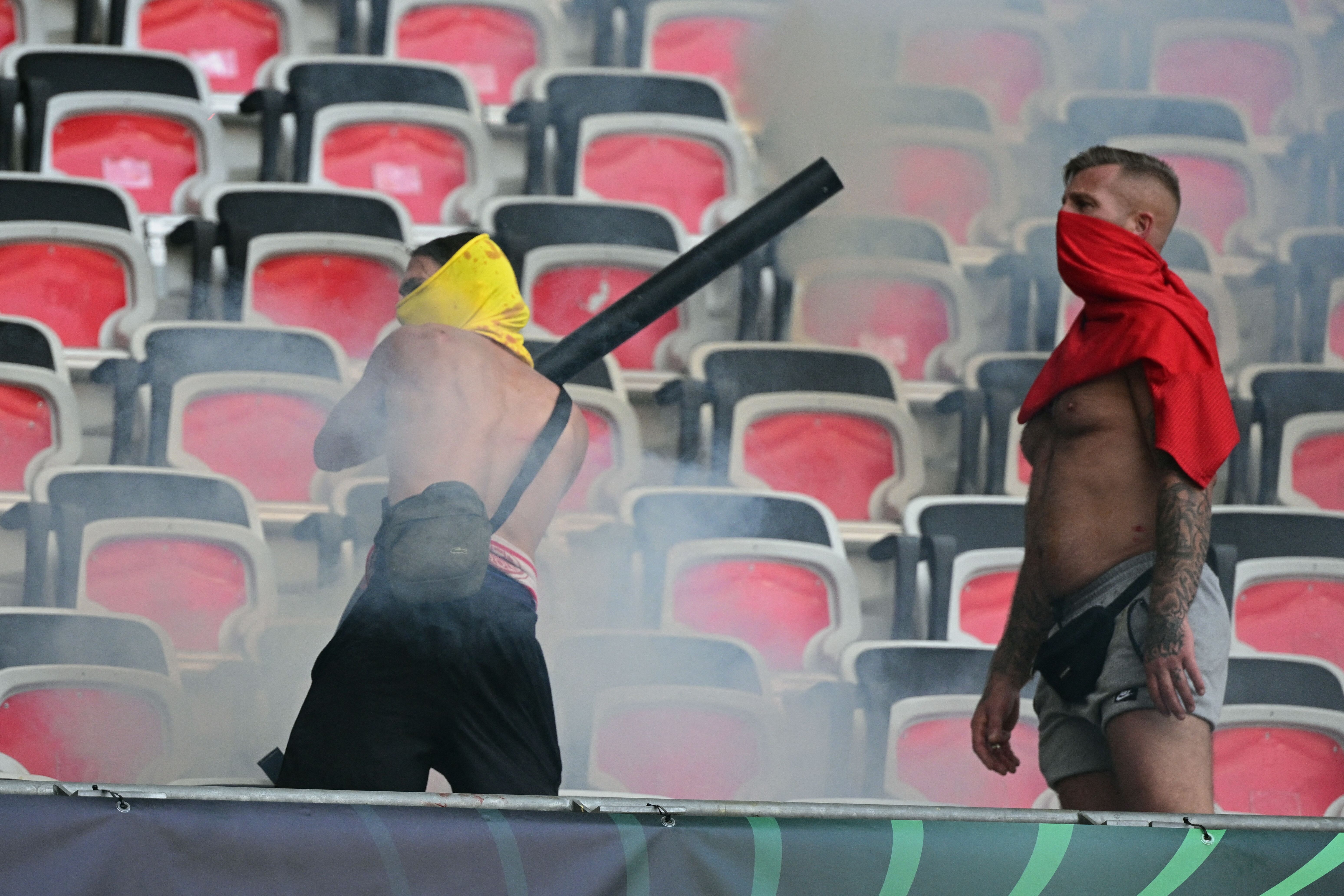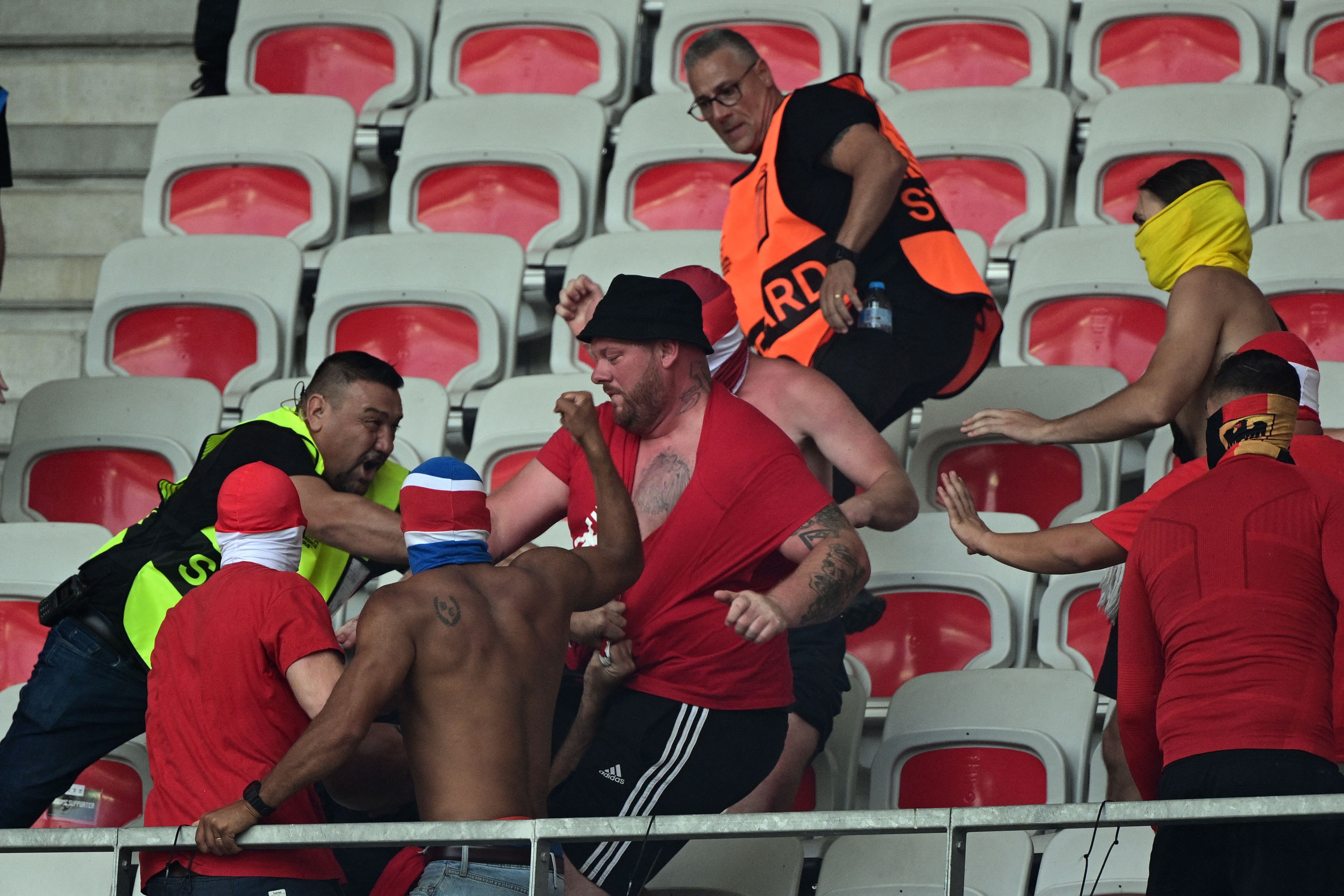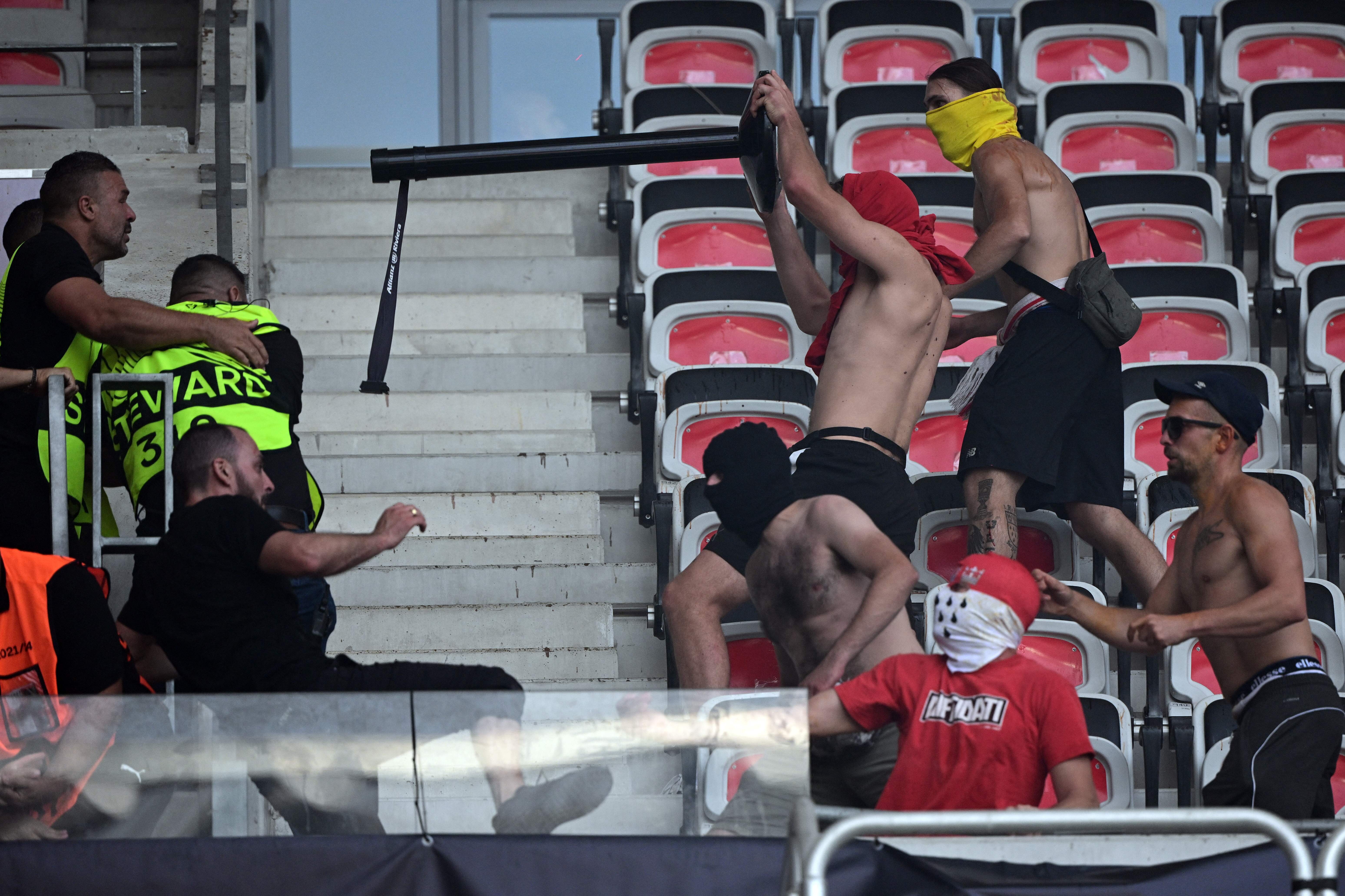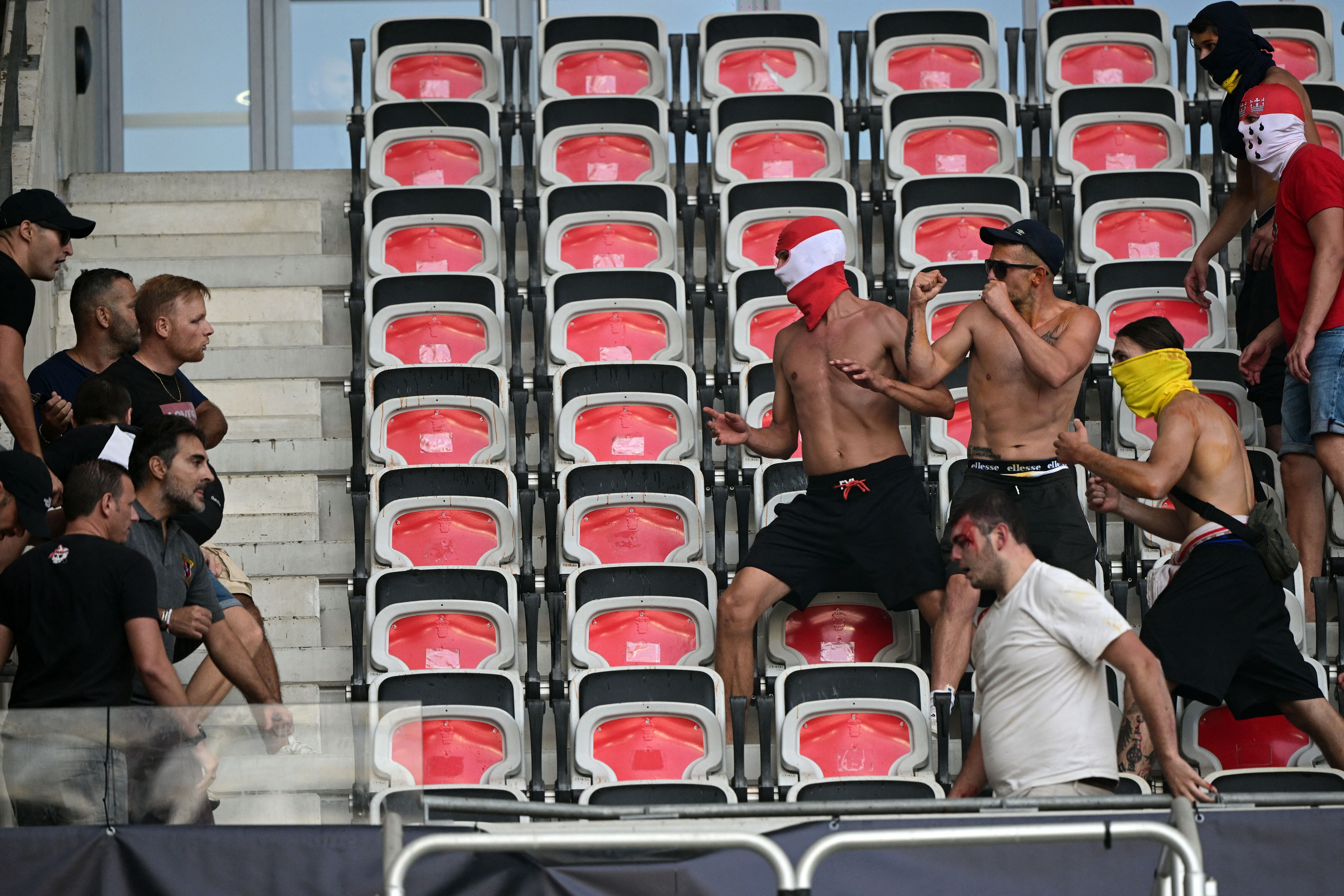 Përplasjet e dhunshme mes dy tifozërive të nisura tashmë gjatë ditës dhe në qytet, vazhduan me mbërritjen e tyre pranë stadiumit të Nice. Policia franceze përdori gaz lotsjellës, por sipas mediave lokale ata pranuan se ishin pushtuar nga grupi i tifozëve gjermanë, që u dyndën në “Cote d’Azur”.