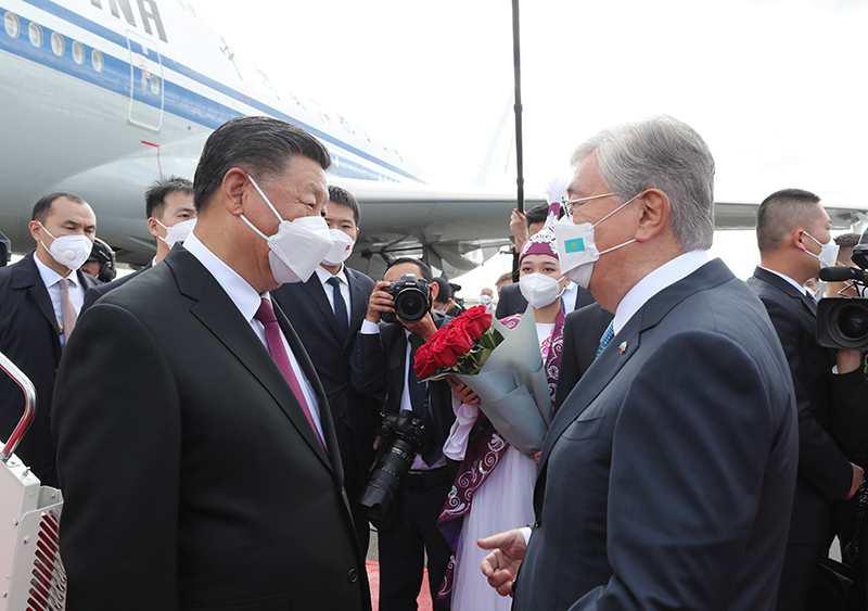 Presidenti i Kazakistanit Kassym-Jomart Tokayev e priti presidentin Xi Jinping në aeroport. Kazakistani është ndalesa e parë e këtij turneu vizitash të presidentit kinez.