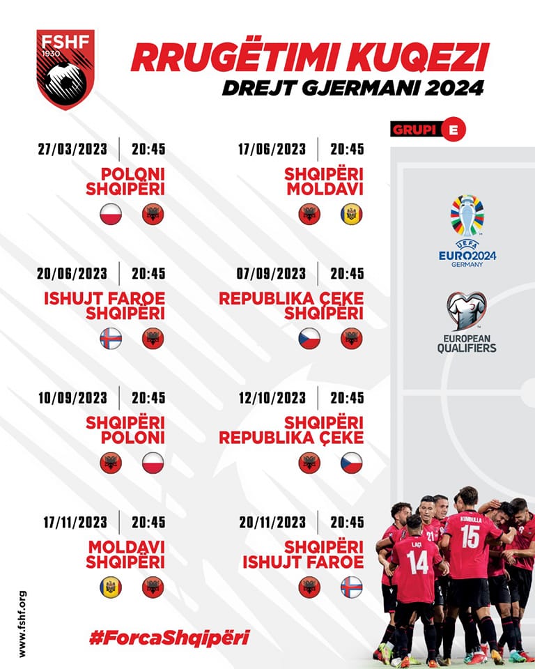 U hodh dje shorti i eliminatoreve të Kampionatit Europianin 2024, që do të luhet në Gjermani. Përzierja e goglave ka zbardhur edhe rivalët e Shqipërisë, e cila është pozicionuar në Grupi E së bashku me Poloninë, Republikën Çeke, Moldavinë dhe Ishujt Faroe.