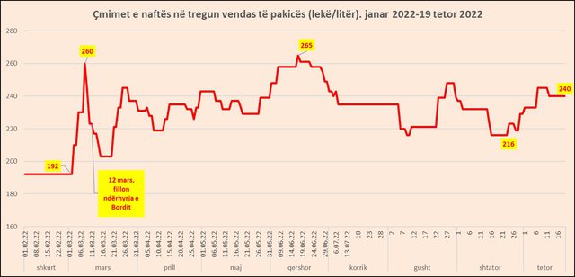 Aktualisht, që prej datës 12 tetor, nafta tregtohet në tregun vendas me 240 lekë për litër, në shifra të ngjashme kur nafta në bursa ishte rreth 1,200 dollarëve për ton. Sipas shpjegimeve të Bordit ky nivel lidhet me ecurinë e naftës në Bursat ndërkombëtare dhe kursin e këmbimit të dollarit.