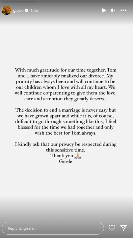 Nga ana tjetër, ka reaguar edhe Gisele. Nëpërmjet postimit të saj ajo u shpreh se prioriteti i tyre do të jenë gjithmonë fëmijët.