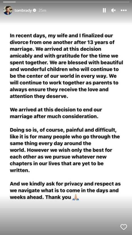 Të dy ata thanë se kishin “mirënjohje” për kohën e kaluar së bashku dhe se vendimi ishte marrë “miqësisht”. Brady shkroi në postimin e tij: