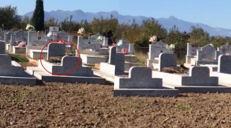 Një qen është duke fjetur mbi varrin e pronarit të tij në varrezat e Shkodrës.