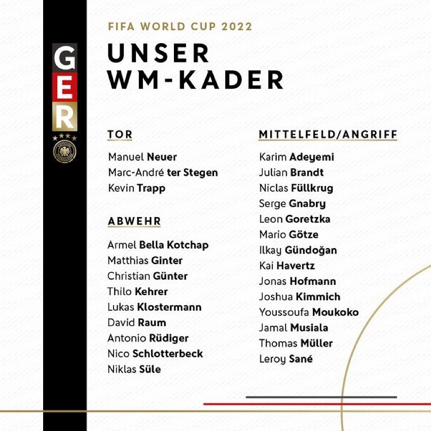 Mesfushorë / sulmues: Julian Brandt, Karim Adeyemi (beide Borussia Dortmund), Leon Goretzka, Joshua Kimmich, Jamal Musiala, Serge Gnabry, Leroy Sané, Thomas Müller (alle FC Bayern), Ilkay Gündogan (Manchester City), Jonas Hofmann (Borussia Mönchengladbach), Mario Götze (Eintracht Frankfurt), Kai Havertz (FC Chelsea), Niclas Füllkrug (Werder Bremen), Youssoufa Moukoko (Borussia Dortmund)