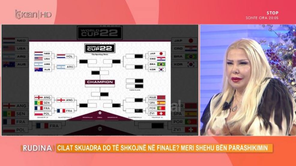 Meri Shehu: Për Spanjën dhe Marokun, është në shenjën e Shigjetarit Spanja, Marokun nuk e di, për herë të parë e kisha parë si skuadër. Ndoshta fiton dhe Maroku sepse tani, nuk e kam nga yjet, nuk më pëlqeu shumë se s’e kam të qartyë shenjën e Marokut, por që mesa di kemi edhe skuadra shumë impulsive në shenjën e Dashit, Japonia, Anglia dhe Franca në shenjën e Luanit. Këto tre skuadra, dy Dashë dhe një Luan marrin një fuqi dhe një potencë të madhe pas datës 20, por ajo është në datën 18 kështu që deri në datën 18 janë këta Peshqit që sikur marrin revansh.