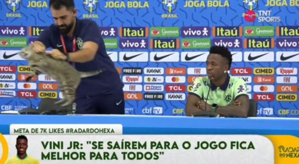 A cara do Vinícius Júnior quando o cara arremessa o gato na coletiva pic.twitter.com/3DpkgIGeSk