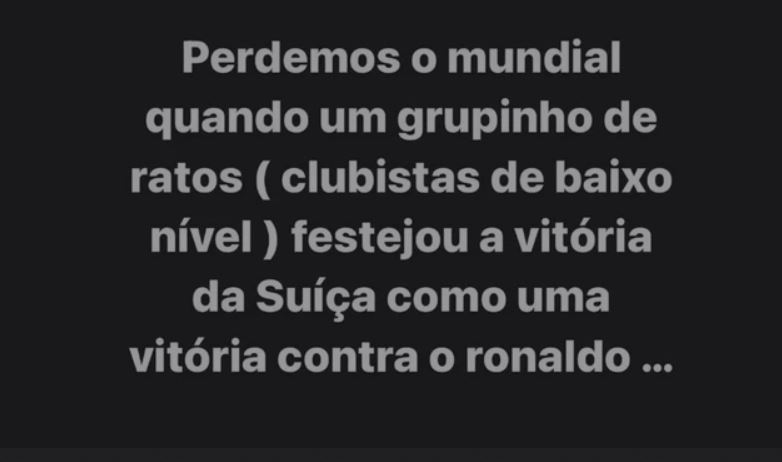 “E humbëm Kupën e Botës kur një grup minjsh (lojtarë të klubeve të nivelit të ulët) festuan fitoren ndaj Zvicrës si fitore ndaj Ronaldos…”,- ka shkruar Catia Aveiro.