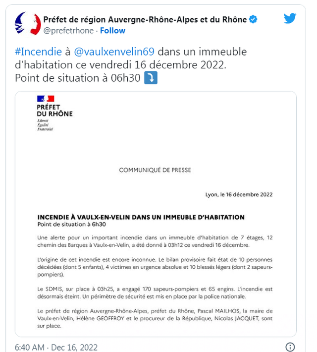 Francë- Tragjedi në Francë. Dhjetë persona kanë humbur jetën në mënyrë tragjike në Francë, si pasojë e një zjarri që shpërtheu në orët e para të mëngjesit sot në lagjen Mas du Taureau, në periferinë lindore të Lionit.