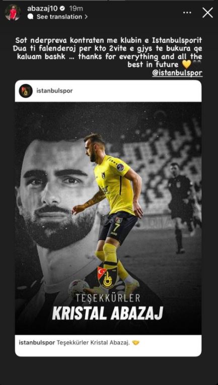 Kristal Abazaj nuk është më lojtar i Istanbulspor. Futbollisti shqiptar ka njoftuar nëpërmjet rrjetet sociale se kontrata me klubin turk është ndërprerë përfundimisht.