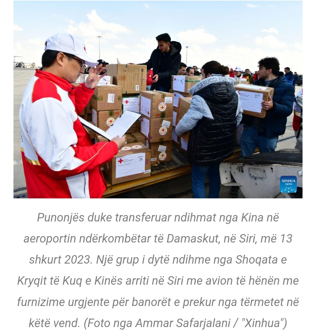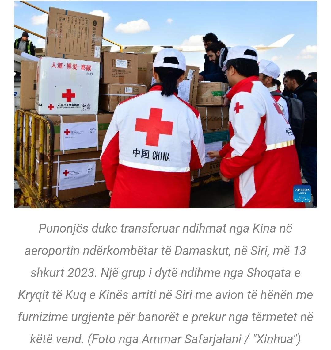 SIRI – Kontigjenti i dytë i ndihmës nga Shoqata e Kryqit të Kuq e Kinës arriti në Siri me avion të hënën, me furnizime urgjente për banorët e prekur nga tërmetet në këtë vend.
