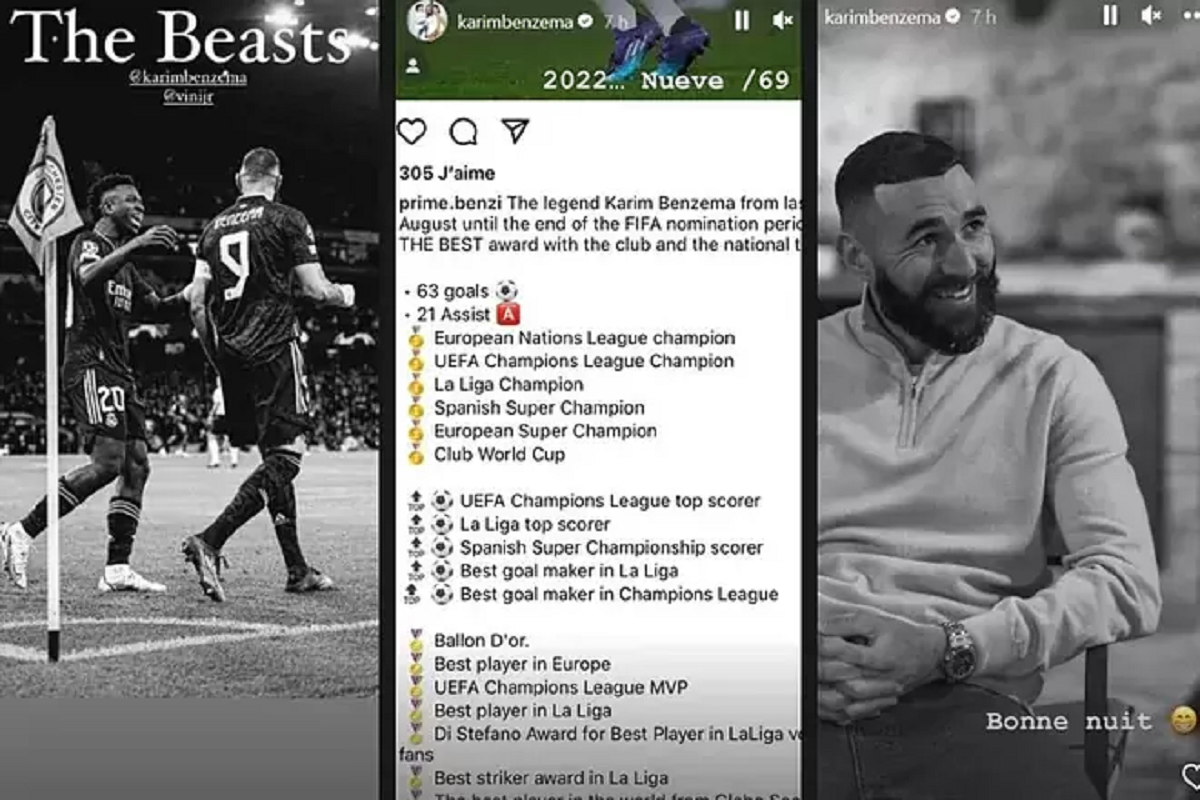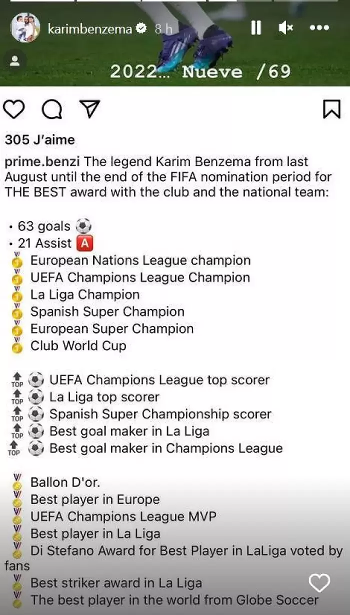Futbollisti francez ka publikuar në Instagram një imazh me të gjithë titujt, trofetë dhe çmimet që ka fituar me Real Madridin dhe kombëtaren transalpine në periudhën kohore që vlerëson “The Best FIFA Awards 2022”. Po kështu, Benzema theksoi 63 golat dhe 21 asistet e tij.