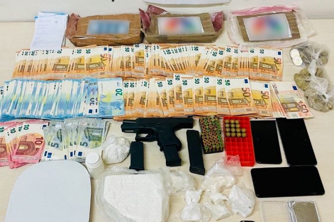 Pas veprimeve të koordinuara të policisë, shqiptarit iu sekuestruan në banesë 663.7 gram kokainë, 1 pistoletë, 3 karikatorë dhe 64 fishekë të kalibrave të ndryshëm, 2 peshore elektronike precize, 3 celularë dhe shuma prej 16.249.5 euro.