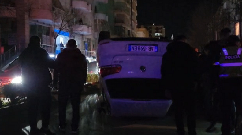 Një mjet ka devijuar nga rruga, dhe pasi ka rrëshqitur e përplasur, është kthyer përmbys në mes të rrugës.