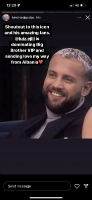 Ai ka postuar në Instagram një foto të tij duke vlerësuar strategjinë e tij me një mesazh anglisht. “Përshëndes këtë ikonë dhe fansat e tij të mbrekullueshëm. Luiz Ejlli është duke dominuar Big Brother Vip, dërgoj gjithë dashurinë time drejt Shqipërisë”-shkruan ai.