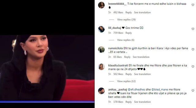 Mjafton të hapni profilin e Efit dhe në komente shihet qartë se shumica e mbështesin për lojën e saj. Madje banores ka nisur t’i rriten ndjekësit. Kujtojmë që dy ditë më parë Efi u kritikua shumë pas rifutjes në “Big Brother VIP2”, por debati në prime ka ndryshuar opinionin e fansave.
