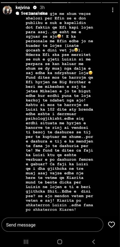 Kejvina shkruan në rrjete sociale se Kiara ka xhelozi për Efin që e kapi lojën shpejt dhe se ka mbështetje nga publiku.