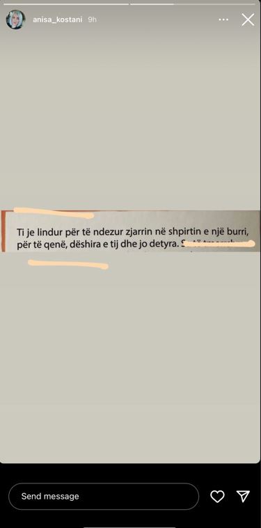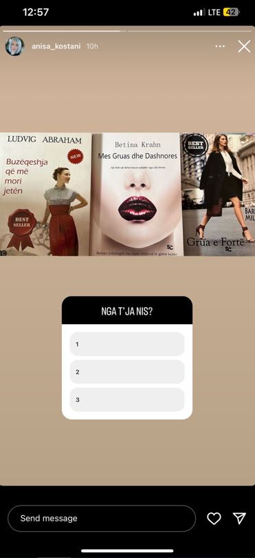 “Mes gruas dhe dashnores: Ti ke lindur për të ndezur zjarrin në shpirtin e një burri”, ka shkruar Kostani në një story në Instagram, teksa e ka shoqëruar me foton e tre librave.
