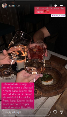 “Gëzuar për Kiarën dhe Luizin. Faleminderit familja Tito për mirëkuptimin e dhuruar! Arbeni, babai i Kiarës dhe unë ndodhemi në Tiranë, për një darkë ku më ka ftuar. Babai i Kiarës do ikë nesër, unë do të rri për shumë surpriza”, shkruan Ina Ejlli.
