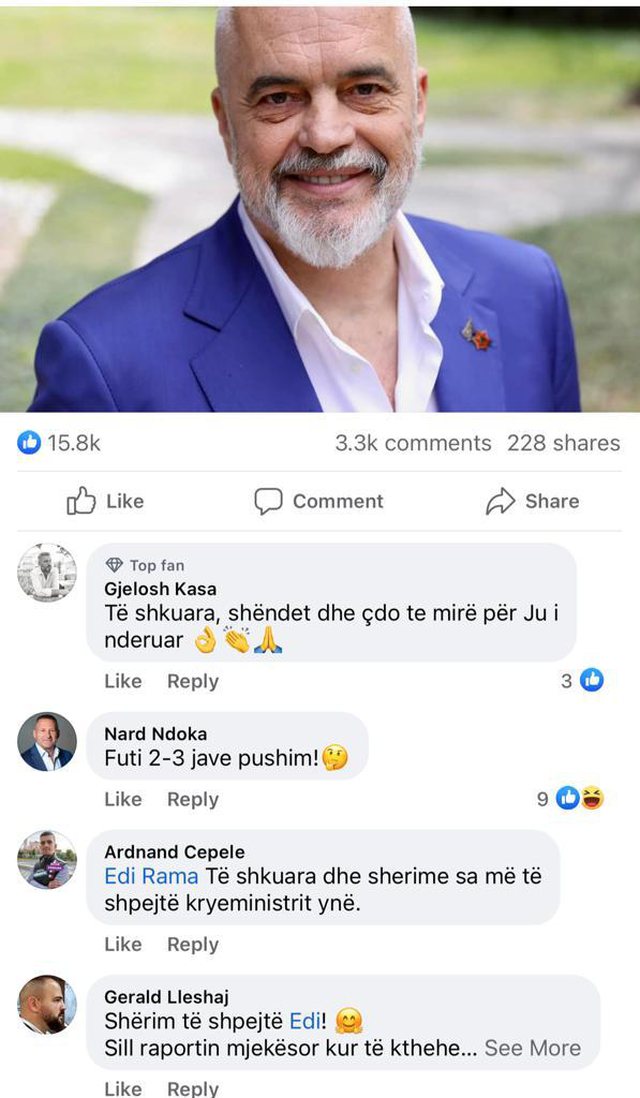 Kreu i Partisë Demokristiane, Nard Ndoka nuk ka lënë pa bërë një koment tek postimi i kryeministrit Edi Rama, ku njoftonte se ishte shumë mirë me shëndet pas operacionit për heqjen e apendicitit, falënderonte mjekët dhe bënte me dije se do të rikthehej shumë shpejt.