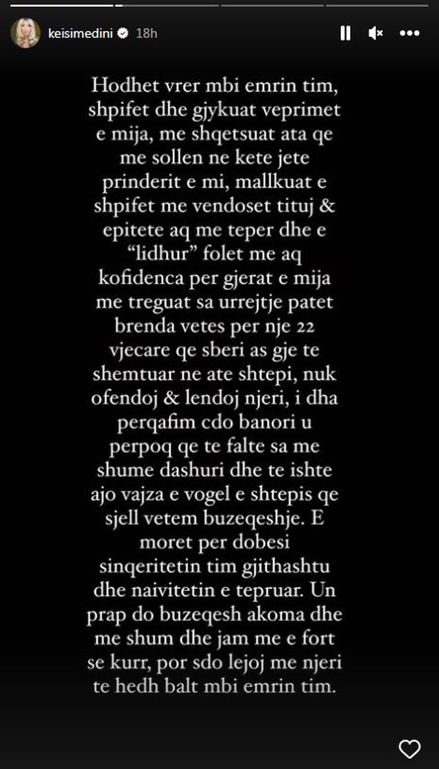 “Hodhët vrer mbi emrin tim, shpifët dhe gjykuat veprimet e mia, më shqetësuat ata që më sollën në këtë jetë, prindërit e mi, mallkuat e shpifët, më vendosët tituj dhe epitete, aq më tepër edhe “e lidhur”. Folët me aq kofidenca për gjërat e mia. Treguat gjithë urrejtjen që patët brenda vetes për një 22-vjeçare që s’bëri asgjë të shëmtuar në atë shtëpi, nuk ofendoi e lëndoi njeri. I dha përqafim çdo banori, u përpoq të falte sa më shumë dashuri dhe të ishte ajo vajza e vogël e shtëpisë, që sjell vetëm buzëqeshje. E morët për dobësi sinqeritetin tim, gjithashtu edhe naivitetin e tepruar. Unë prapë do të buzëqesh akoma më shumë dhe jam më e fortë se kurrë, por s’do të lejoj më njeri të hedhë baltë mbi emrin tim”.