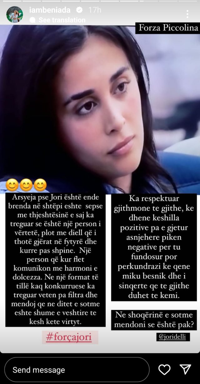 Tashmë të gjithë e dinë për shoqërinë e ngushtë që Beniada ka me një nga banoret e “BBV2”, Jori Dellin dhe këtë mund ta shohim edhe në rrjete sociale, ku shikon se sa shumë Beniada e suporton Jorin. Jemi shumë afër finales së edicionit të dytë të Big Brother dhe si një nga miket e saj më të mira, Beniada ka bërë një postim në Instagramin e saj, duke mbështetur Jorin dhe treguar vlerat që ajo ka treguar brenda shtëpisë së “BBV2”.