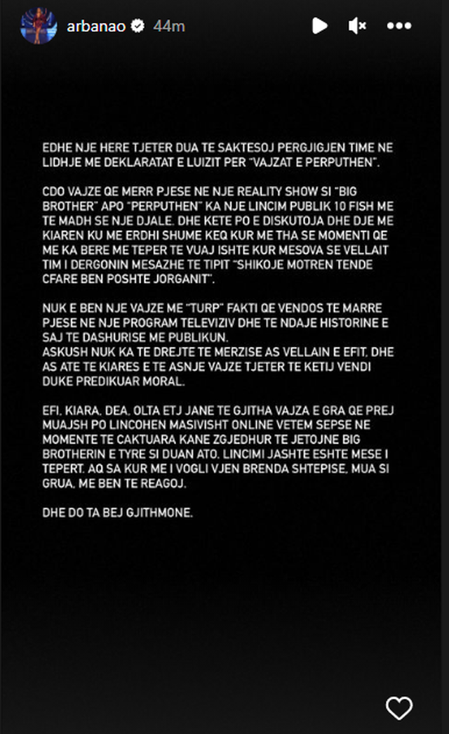 Këtu ndërhyn Arbana dhe shprehet: “Luiz pak respekt për të gjitha këto vajza që marrin pjesë në këto programe. Nuk do doja as dikush të thoshte motrën time nuk do doja ta shikoja si Kiara në një format si Big Brother që shkon aty lidhet me çuna dhe bën dashuri poshtë jorganit. Të paktën ju mos bëni të tilla deklarata”.