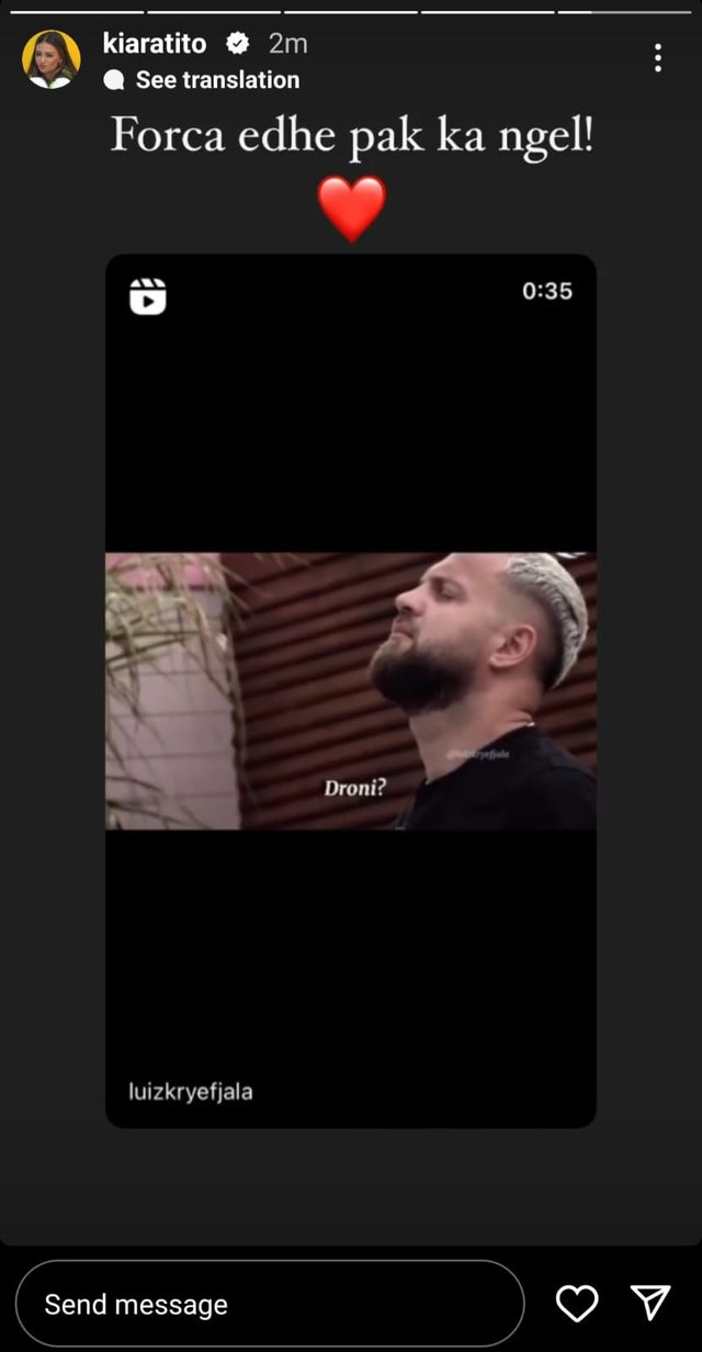 Kiara ka disa ditë që është eleminuar nga shtëpia e “BBV2” e tanimë po kalon kohë me familjarët e saj. Edhe tashmë jashtë shtëpisë Kiara e mbështet Luizin, si në çdo dalje televizive ashtu edhe në rrjete sociale. Së fundmi ka postuar në Instastory një video të tij, duke qëndruar vetëm jashtë në shi dhe ka shkruar një shprehje motivuese dhe përkrahëse ndaj të dashurit të saj.