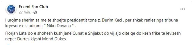 “I urojme sherim sa me te shpejte presidentit tone z. Durim Keci, per shkak renies nga tribuna kryesore e stadiumit “Niko Dovana”.