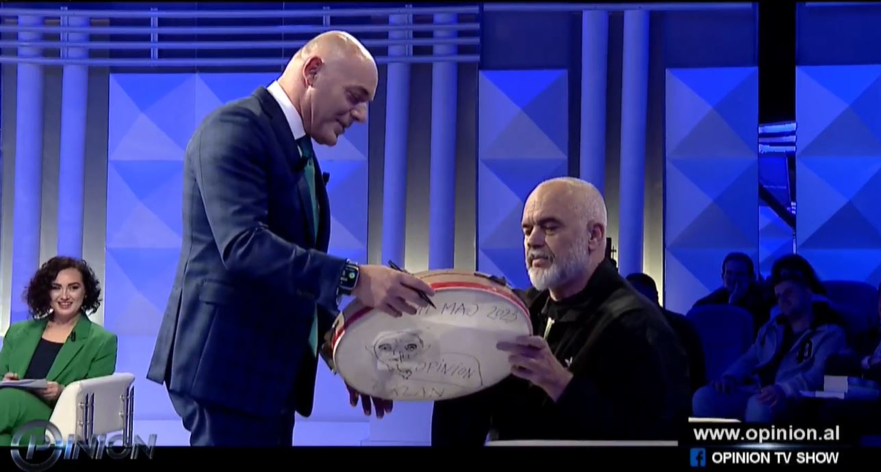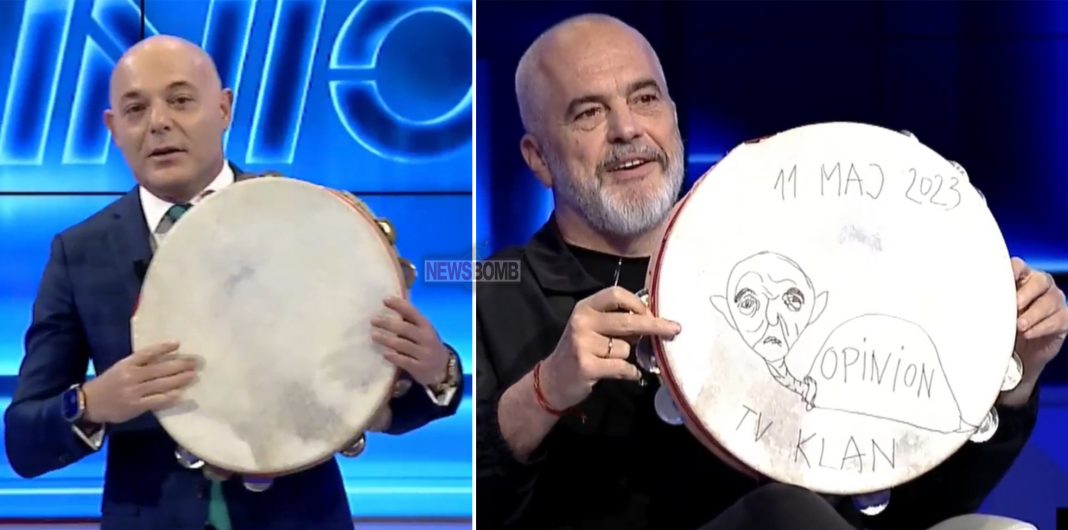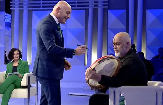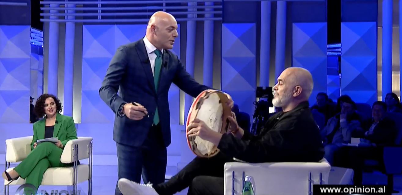 Kryeministri Edi Rama ishte i ftuar në emision nga Blendi Fevziu i cili e ka pritur me dajre, një simbol i fushatës së tij dhe Partisë Socialiste bazuar në tallava.